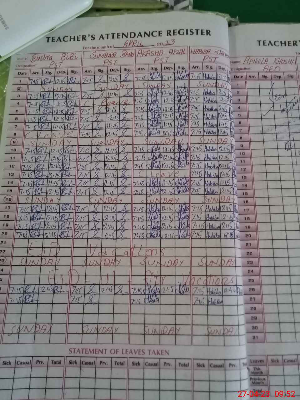 | CNIC | Full Name | Designation | R/C | Absence During Last Calender Month |