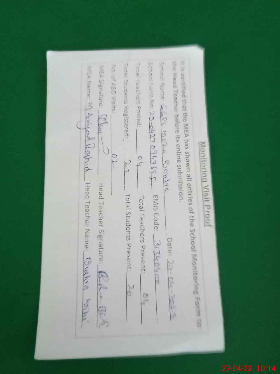 | Attendance Register | Head Teacher | MEA with School | Visit Proof |