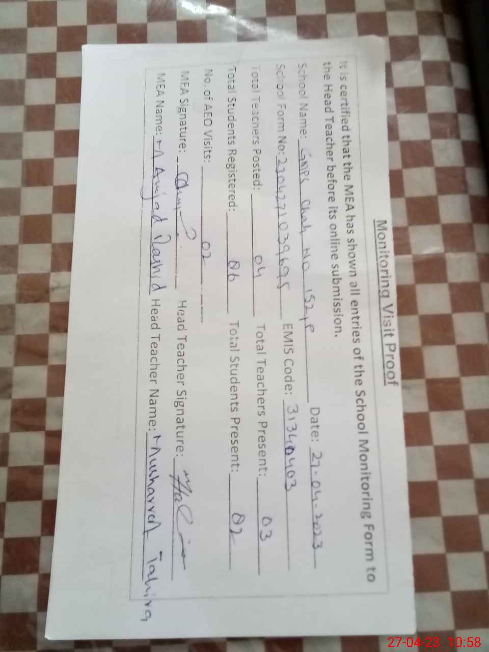 | Attendance Register | Head Teacher | MEA with School | Visit Proof |