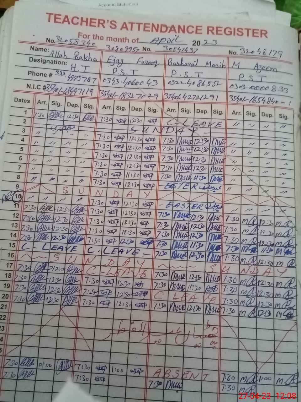 | CNIC | Full Name | Designation | R/C | Absence During Last Calender Month |