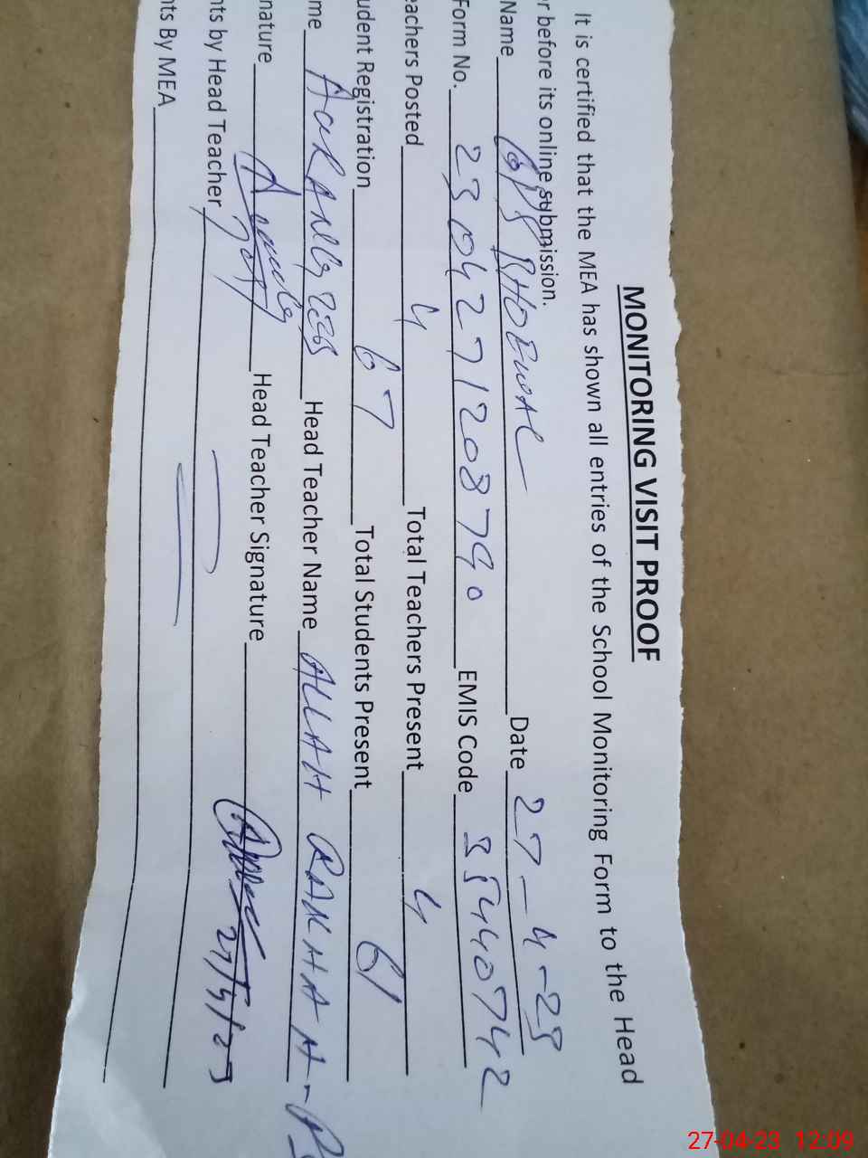 | Attendance Register | Head Teacher | MEA with School | Visit Proof |