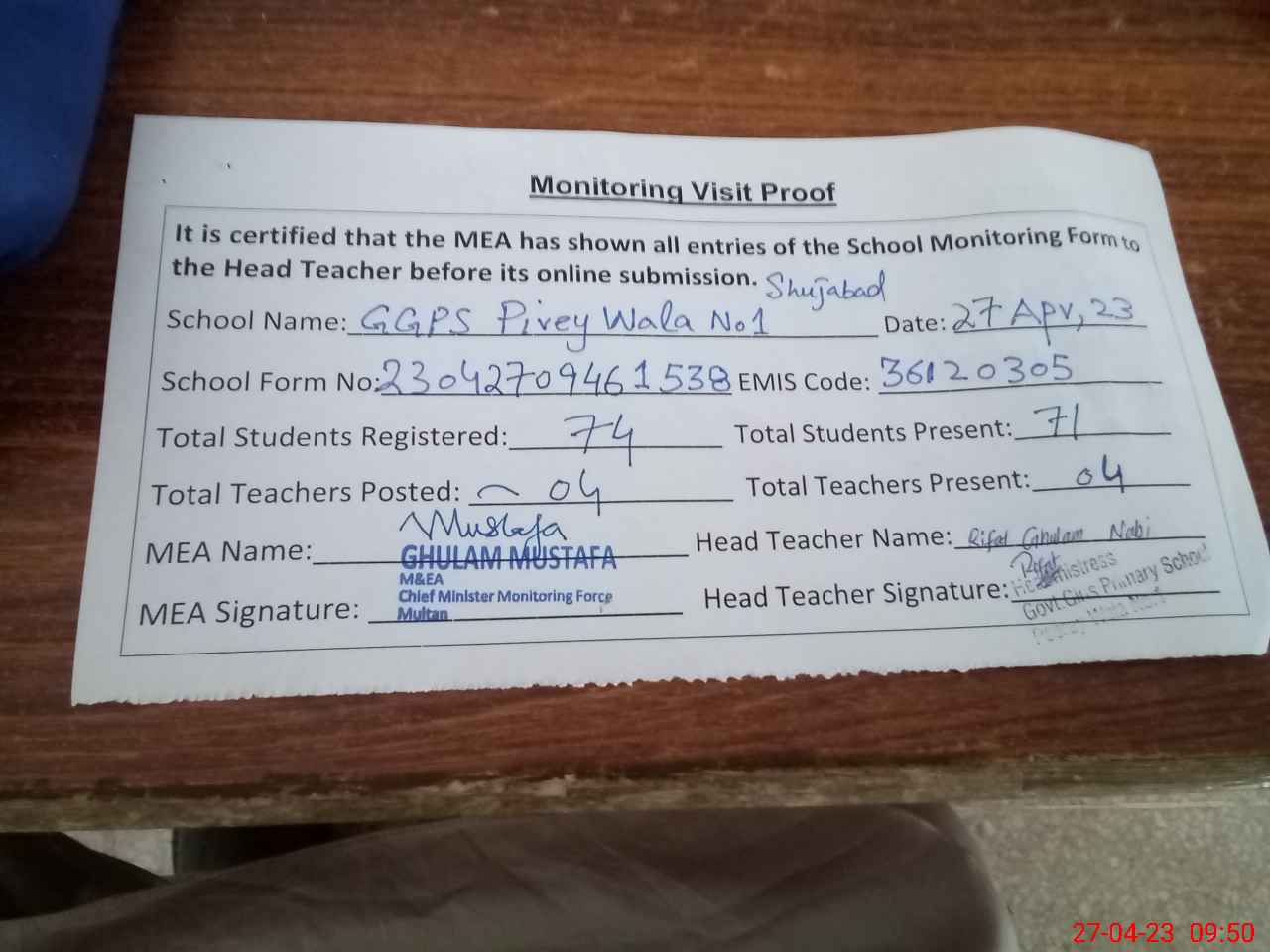 | Attendance Register | Head Teacher | MEA with School | Visit Proof |