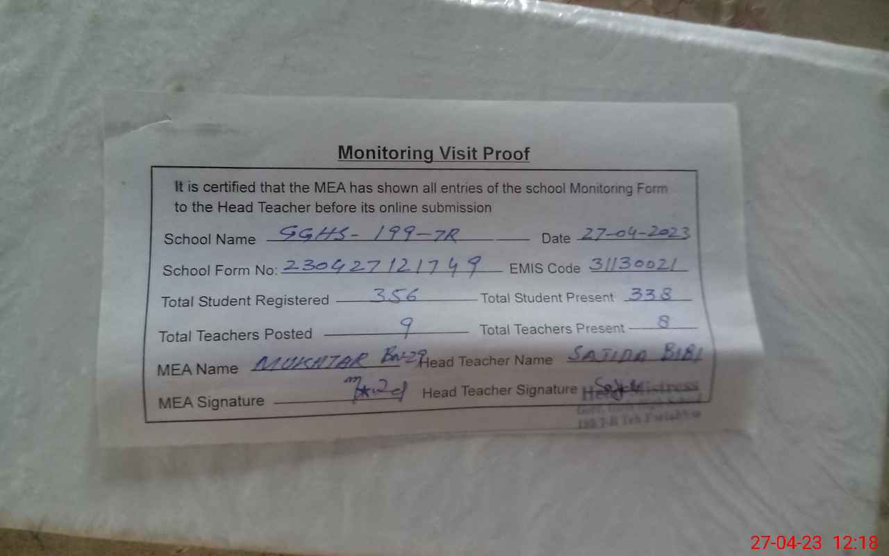 | EMIS Code: 31130021 | Name of School: GGHS CHAK NO.199/7-R | |||