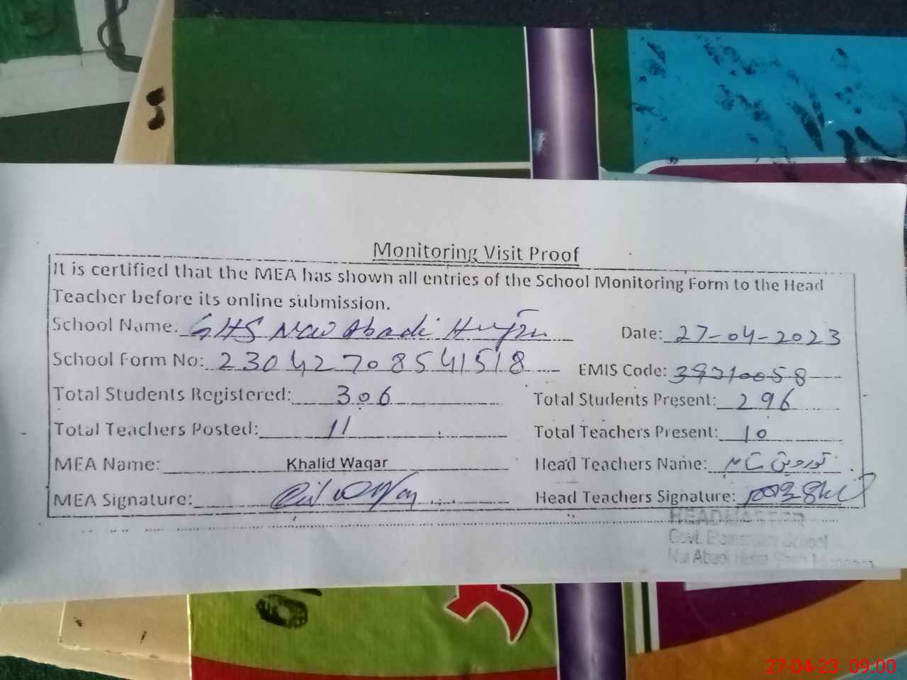 | Attendance Register | Head Teacher | MEA with School | Visit Proof |