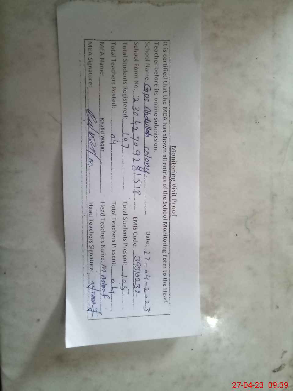 | EMIS Code: 39310232 | Name of School: GPS ABDULLAH COLONY | |||