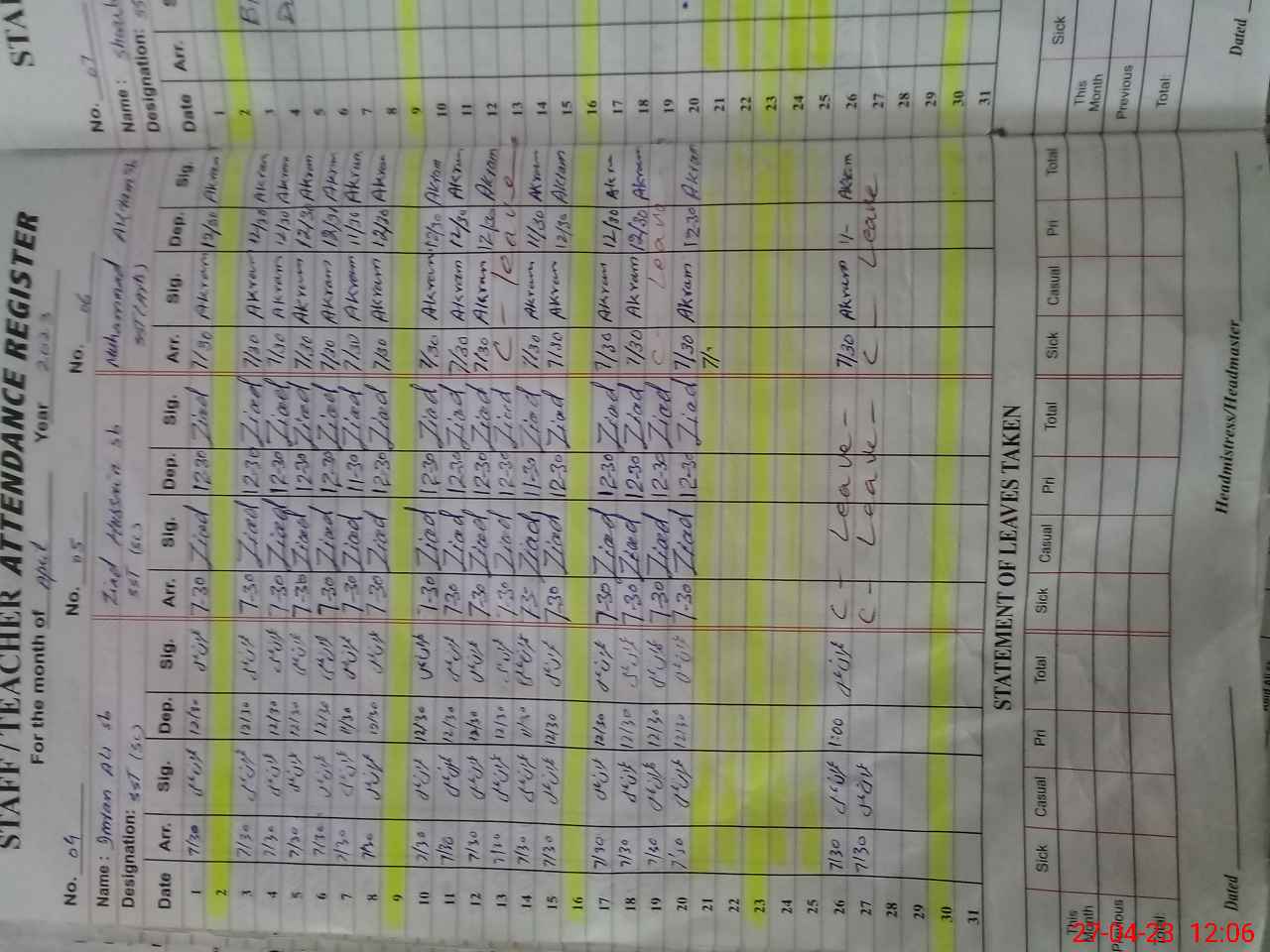 | CNIC | Full Name | Designation | R/C | Absence During Last Calender Month |