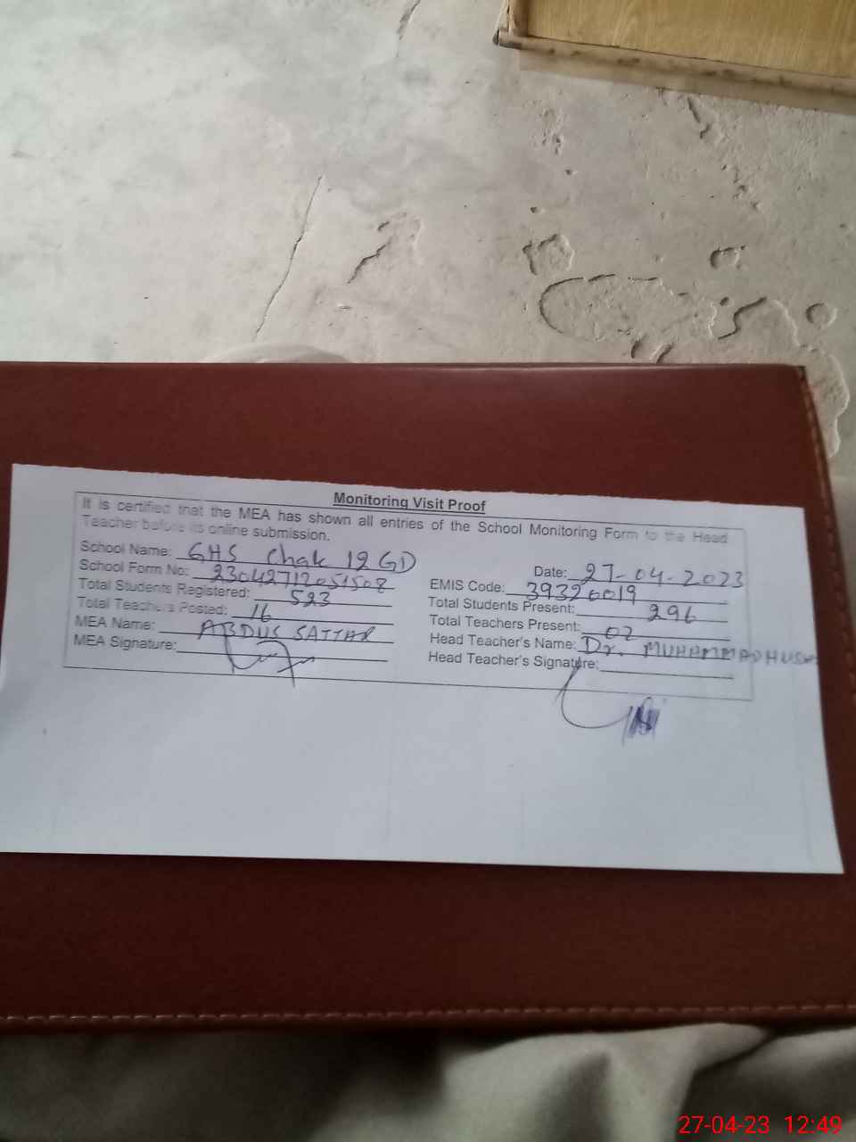 | Attendance Register | Head Teacher | MEA with School | Visit Proof |