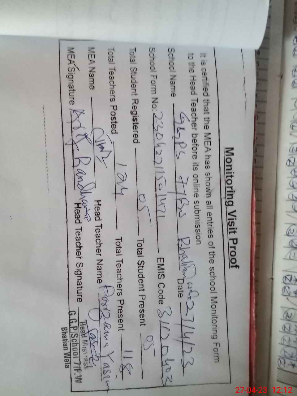 | Attendance Register | Head Teacher | MEA with School | Visit Proof |