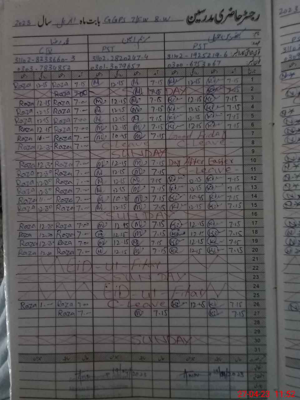 | CNIC | Full Name | Designation | R/C | Absence During Last Calender Month |