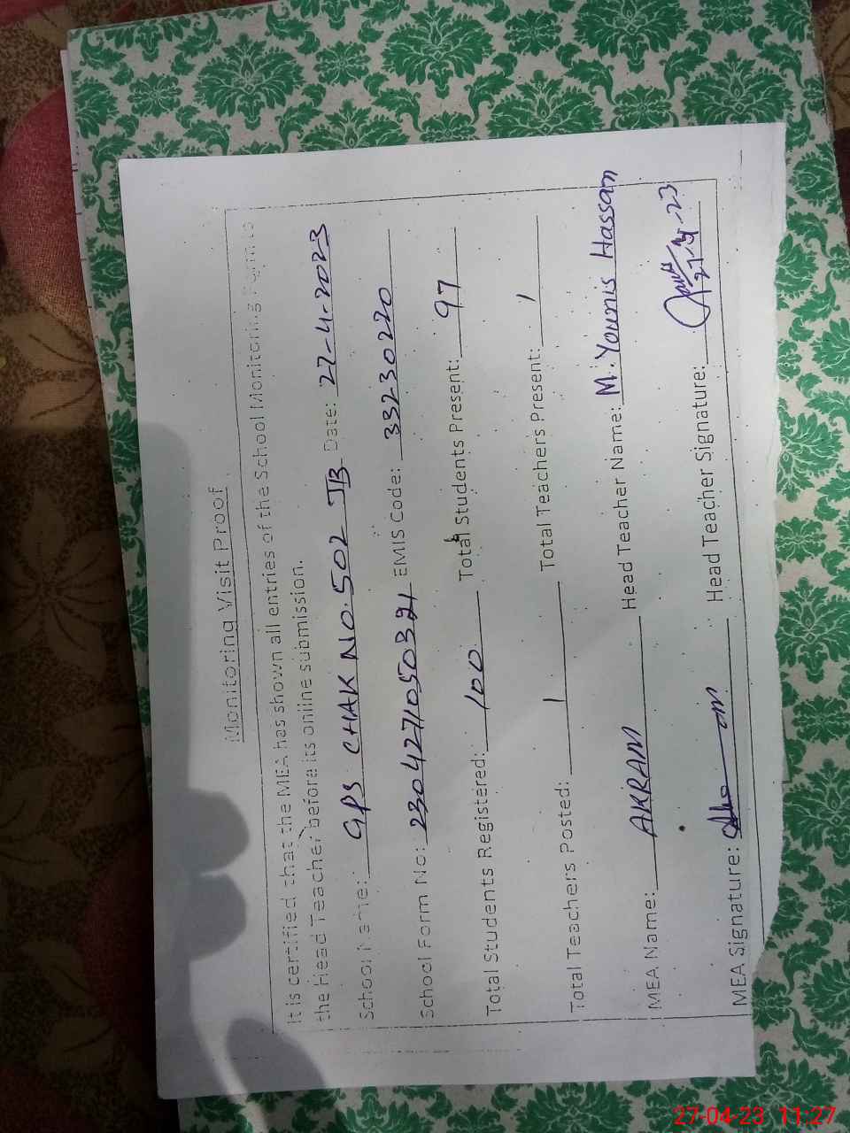 | Attendance Register | Head Teacher | MEA with School | Visit Proof |