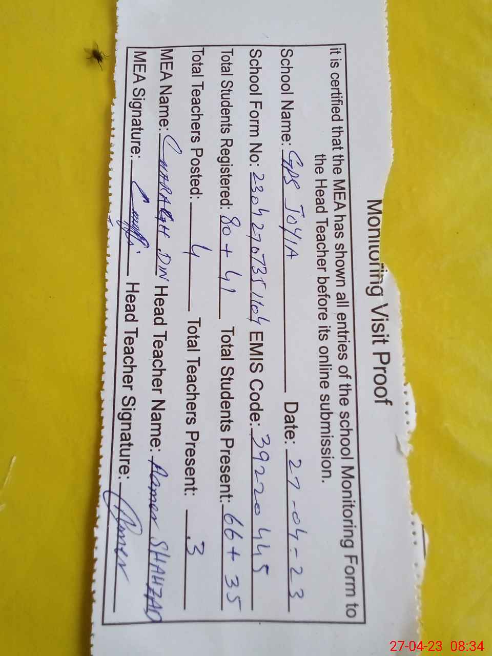 | EMIS Code: 39220445 | Name of School: GPS JOYIA P.O NOORA PATH ARIF WALA | |||