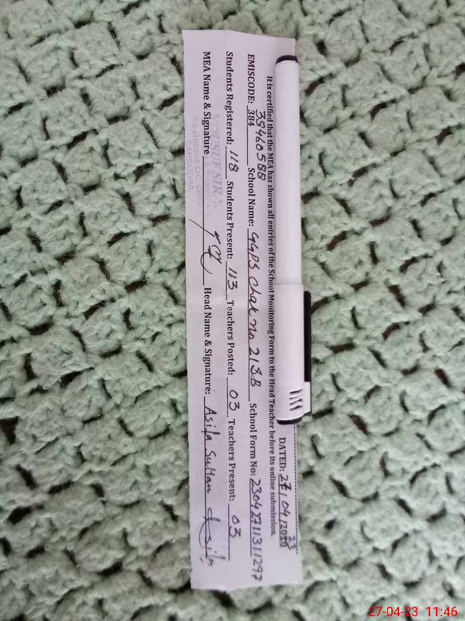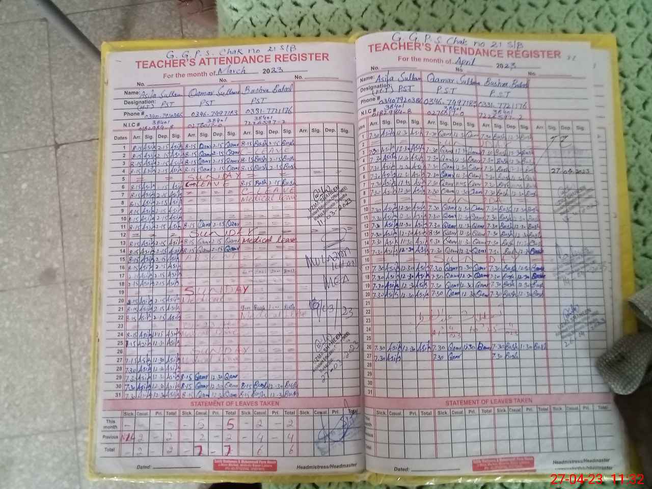 | Name: AS**** SU**** Designation: (School Headmaster's/Headmistress's) PST Phone/Cell Number: 03**** |