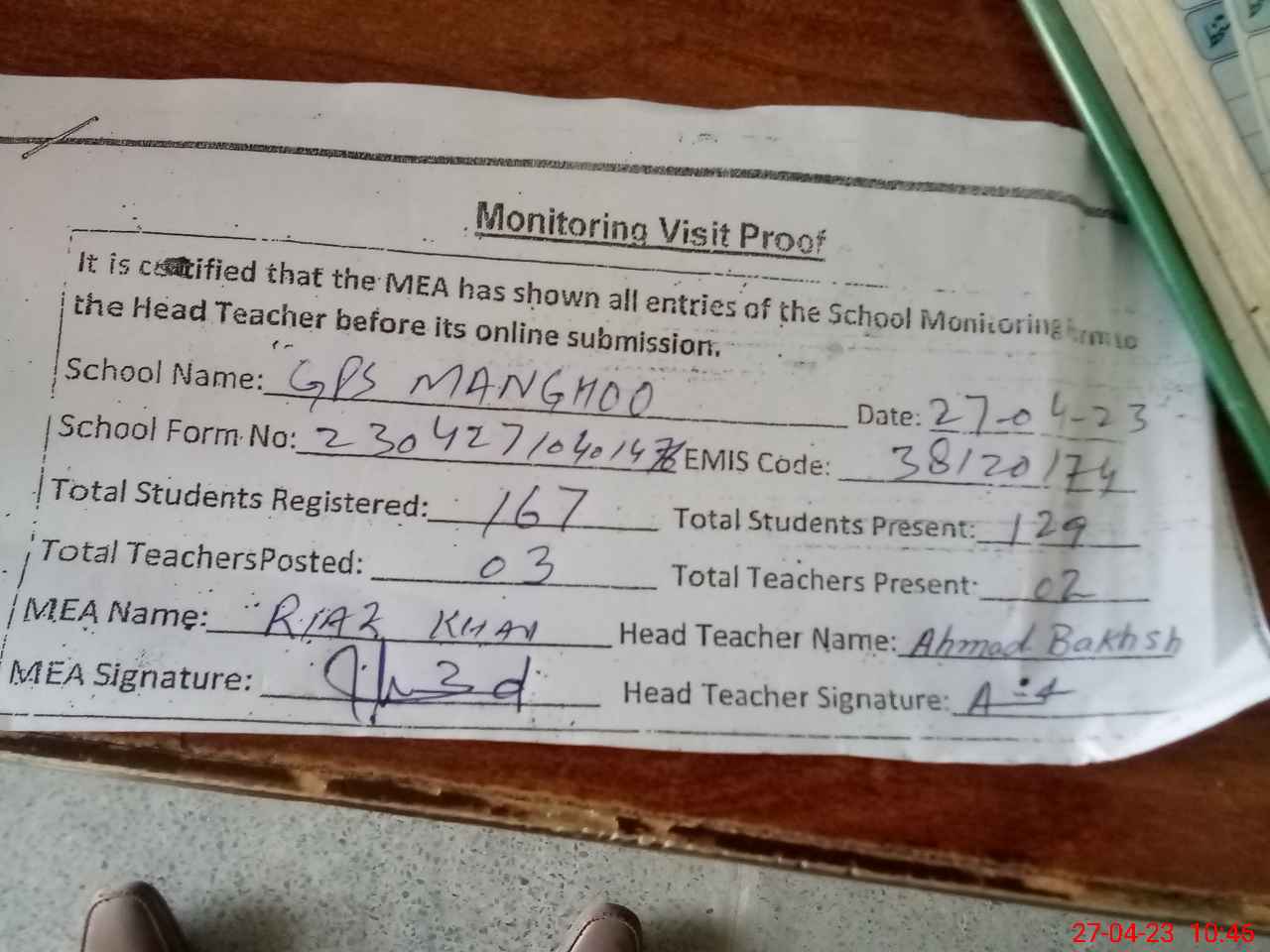 | Attendance Register | Head Teacher | MEA with School | Visit Proof |