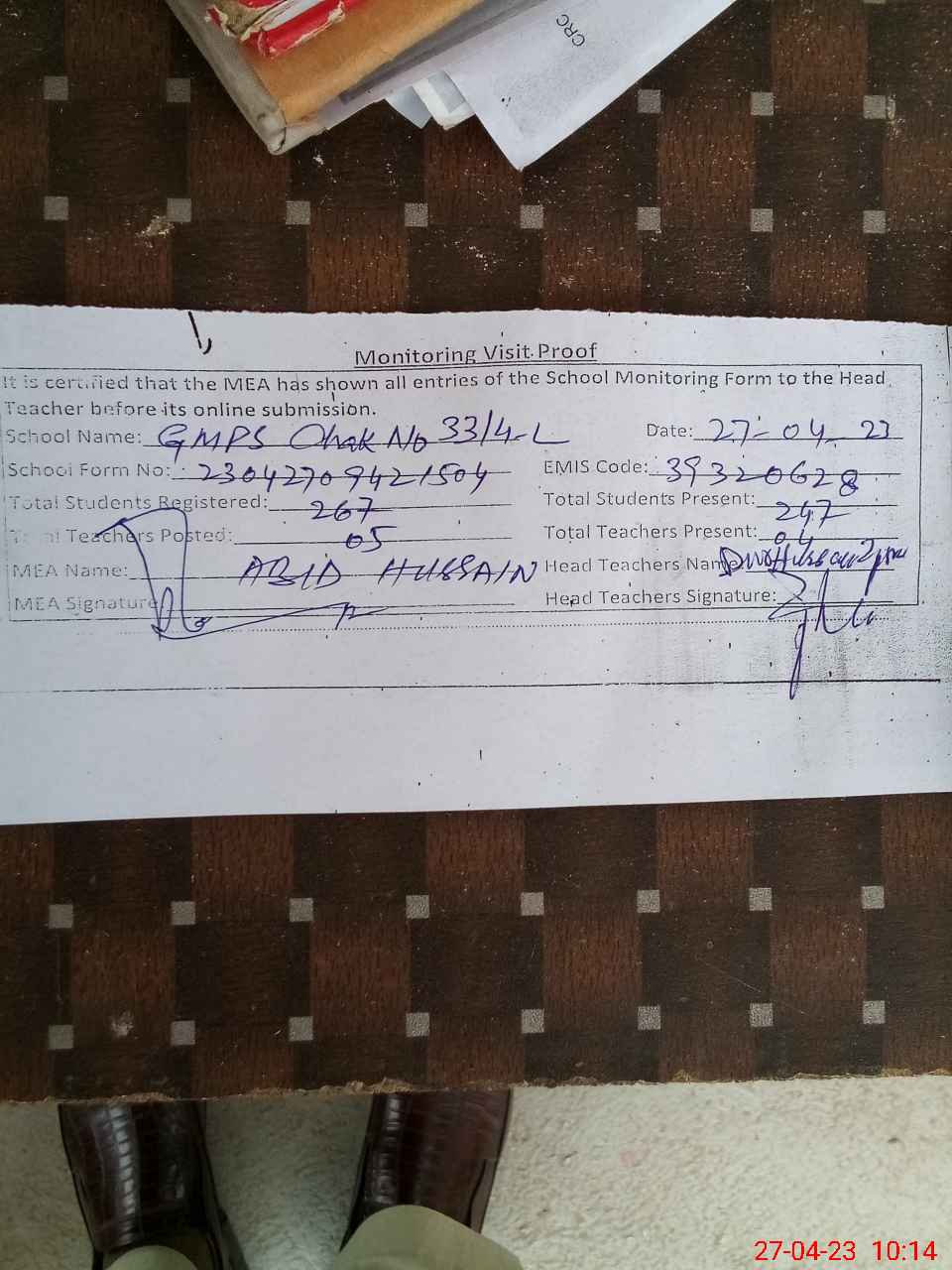 | Attendance Register | Head Teacher | MEA with School | Visit Proof |