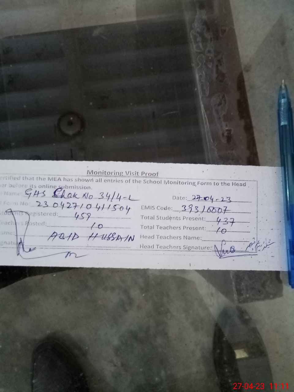 | Attendance Register | Head Teacher | MEA with School | Visit Proof |