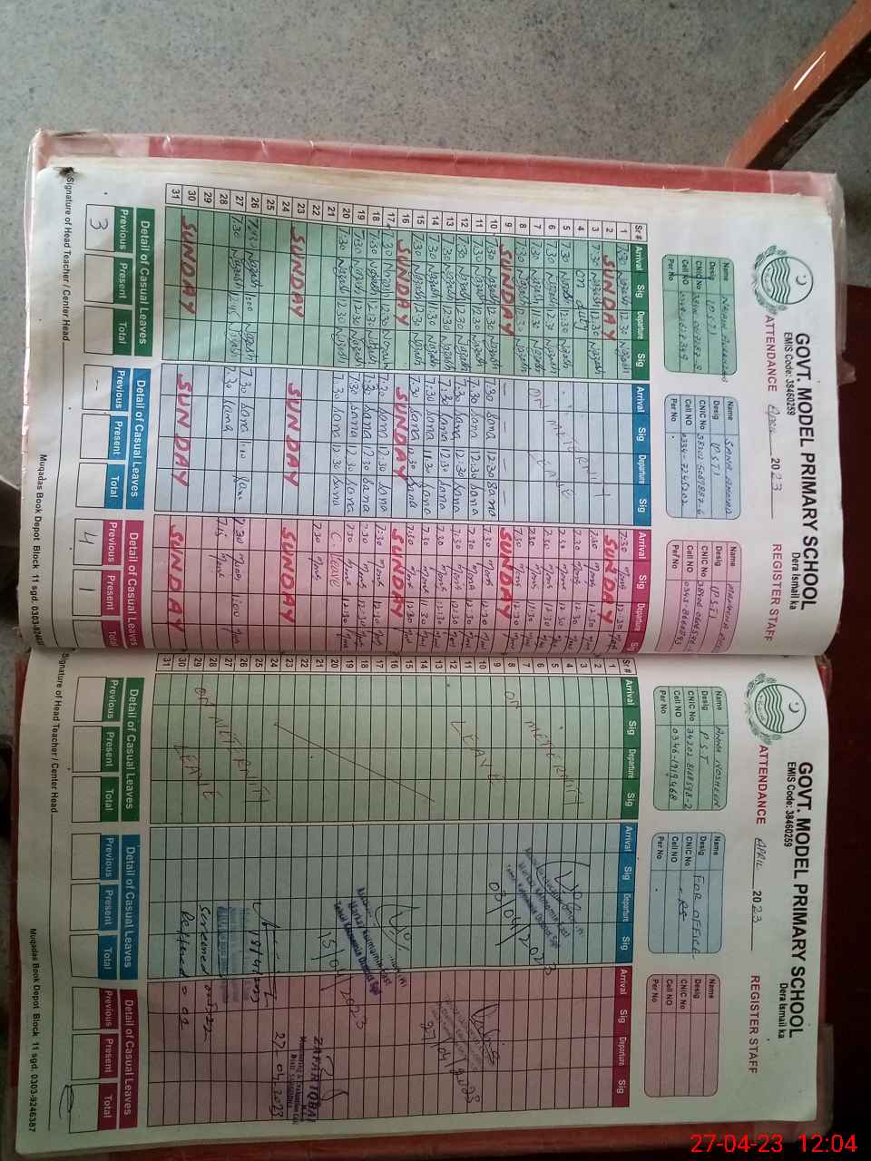 | CNIC | Full Name | Designation | R/C | Absence During Last Calender Month |