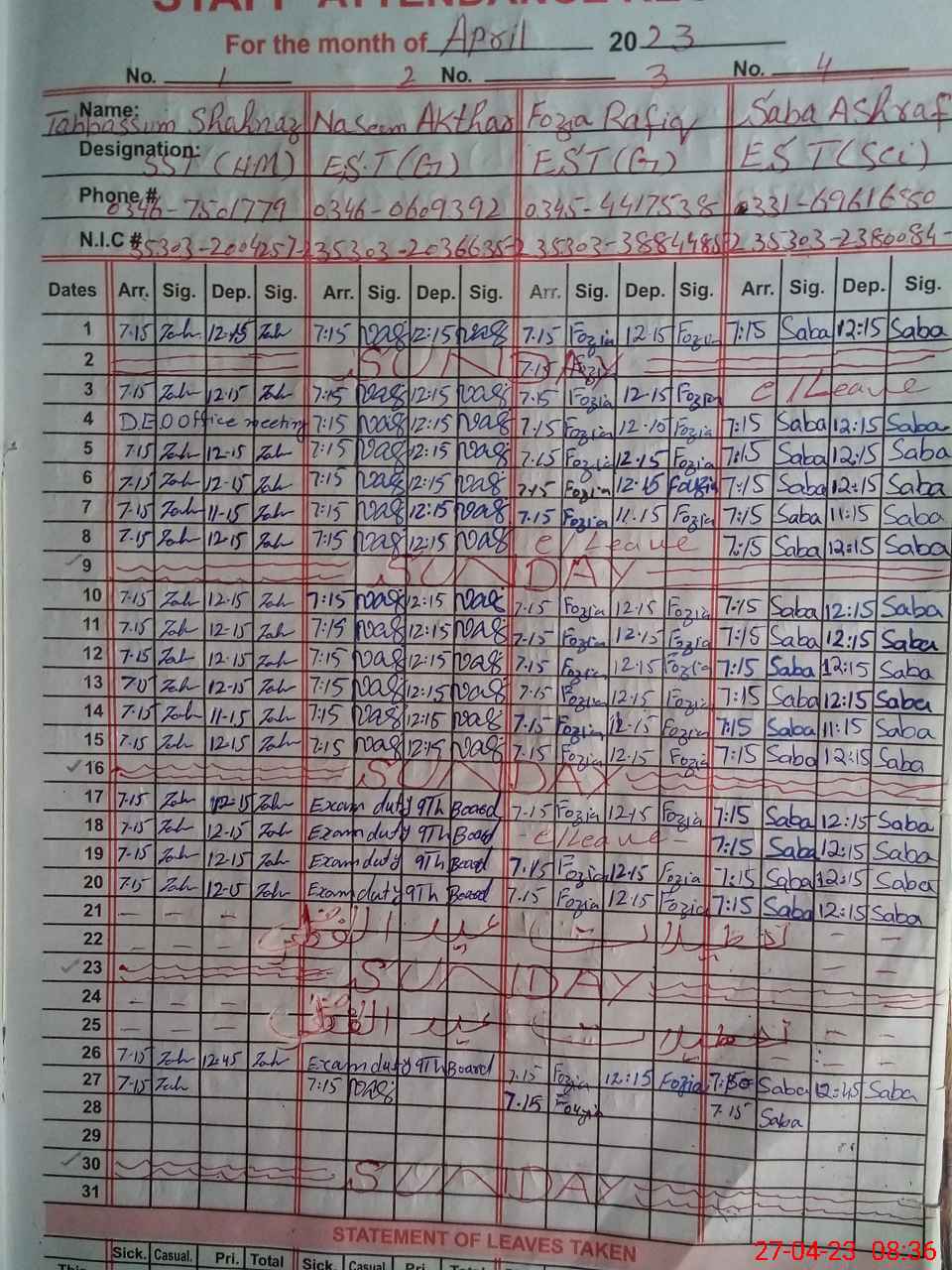 | CNIC | Full Name | Designation | R/C | Absence During Last Calender Month |