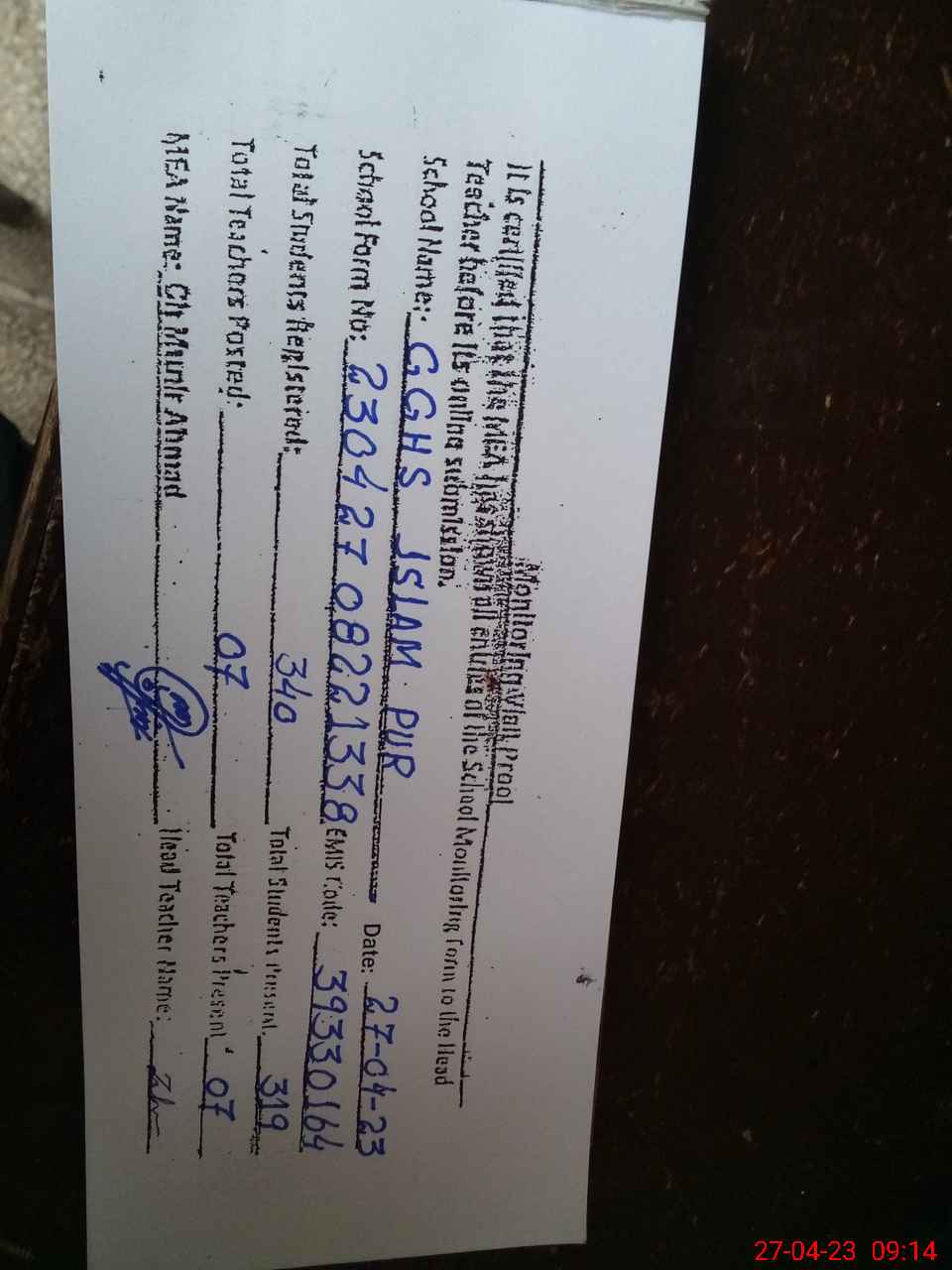 | Name: TA**** SH**** Designation: (School Headmaster's/Headmistress's) Headmaster Phone/Cell Number: 03**** |