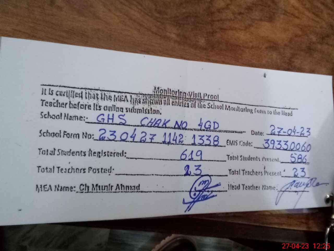 | Attendance Register | Head Teacher | MEA with School | Visit Proof |