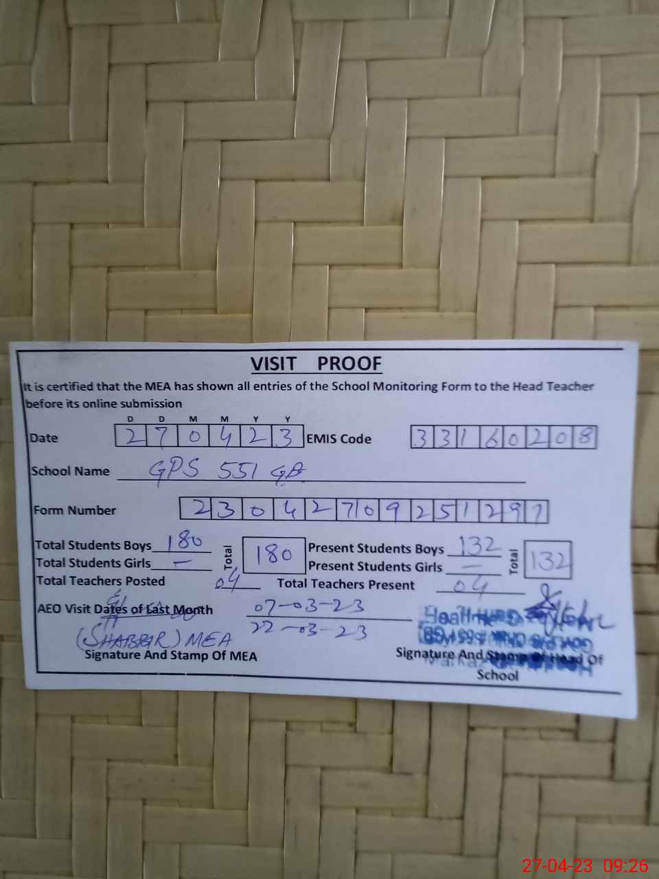 | Attendance Register | Head Teacher | MEA with School | Visit Proof |