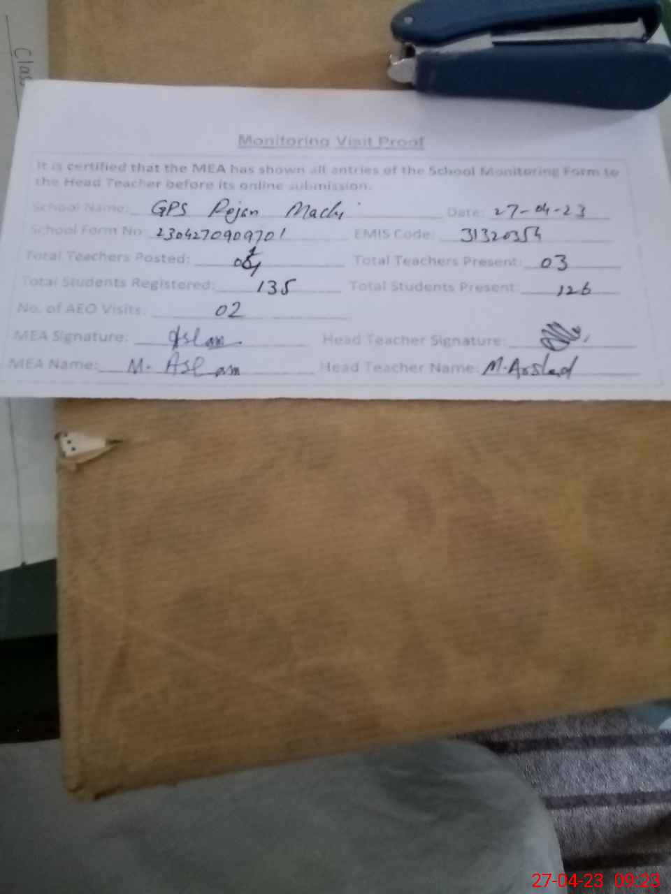 | Attendance Register | Head Teacher | MEA with School | Visit Proof |