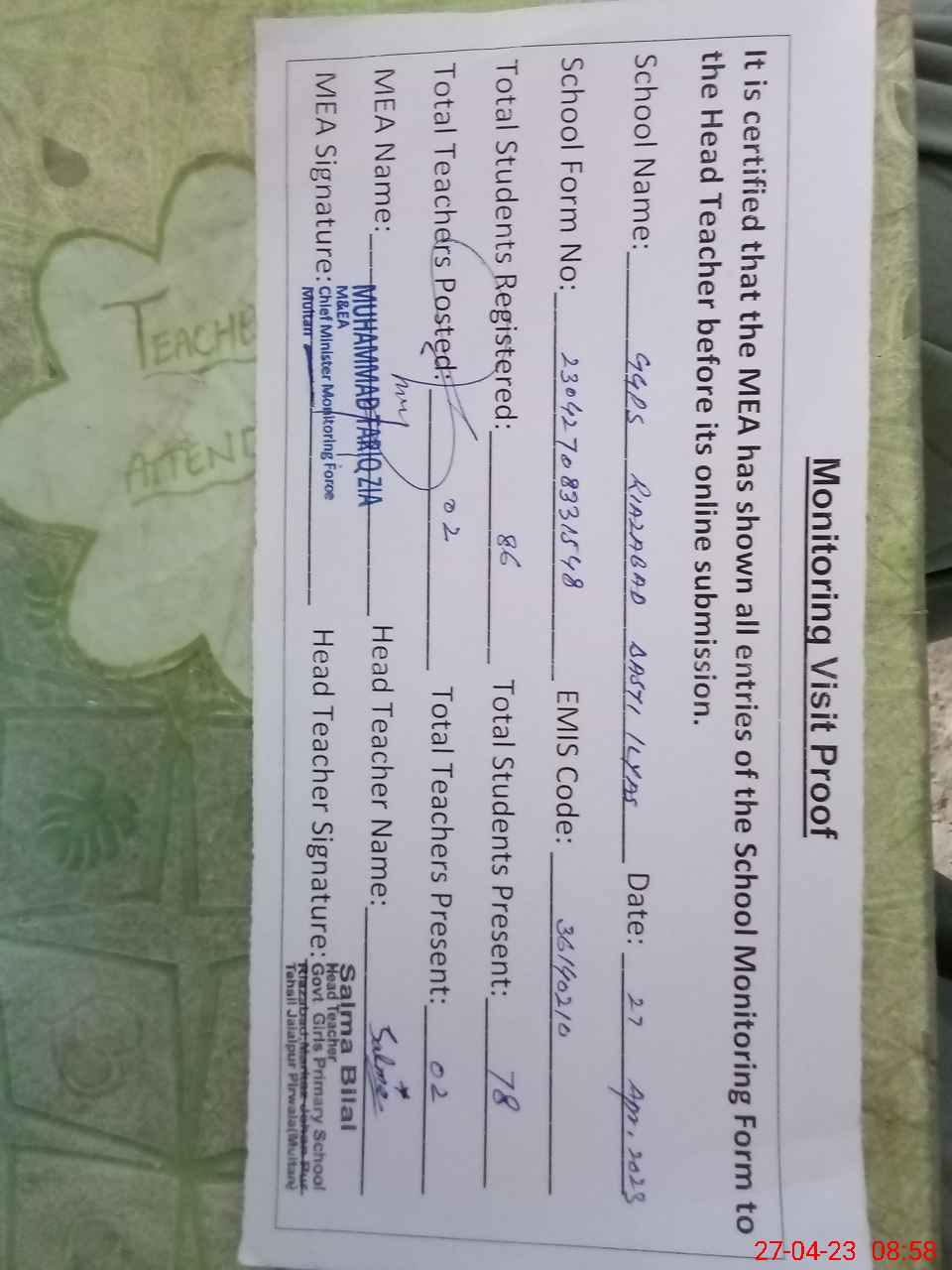 | Attendance Register | Head Teacher | MEA with School | Visit Proof |