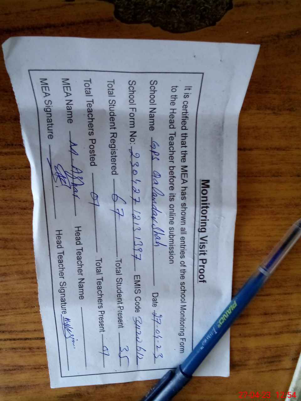 | Attendance Register | Head Teacher | MEA with School | Visit Proof |