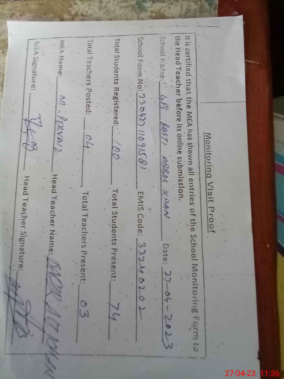 | Attendance Register | Head Teacher | MEA with School | Visit Proof |