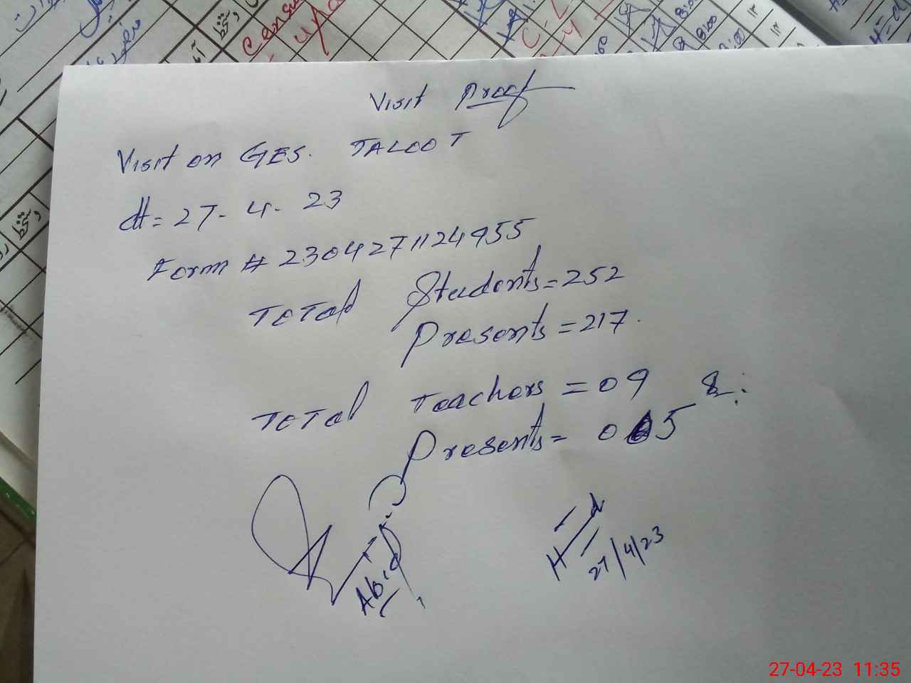| Attendance Register | Head Teacher | MEA with School | Visit Proof |