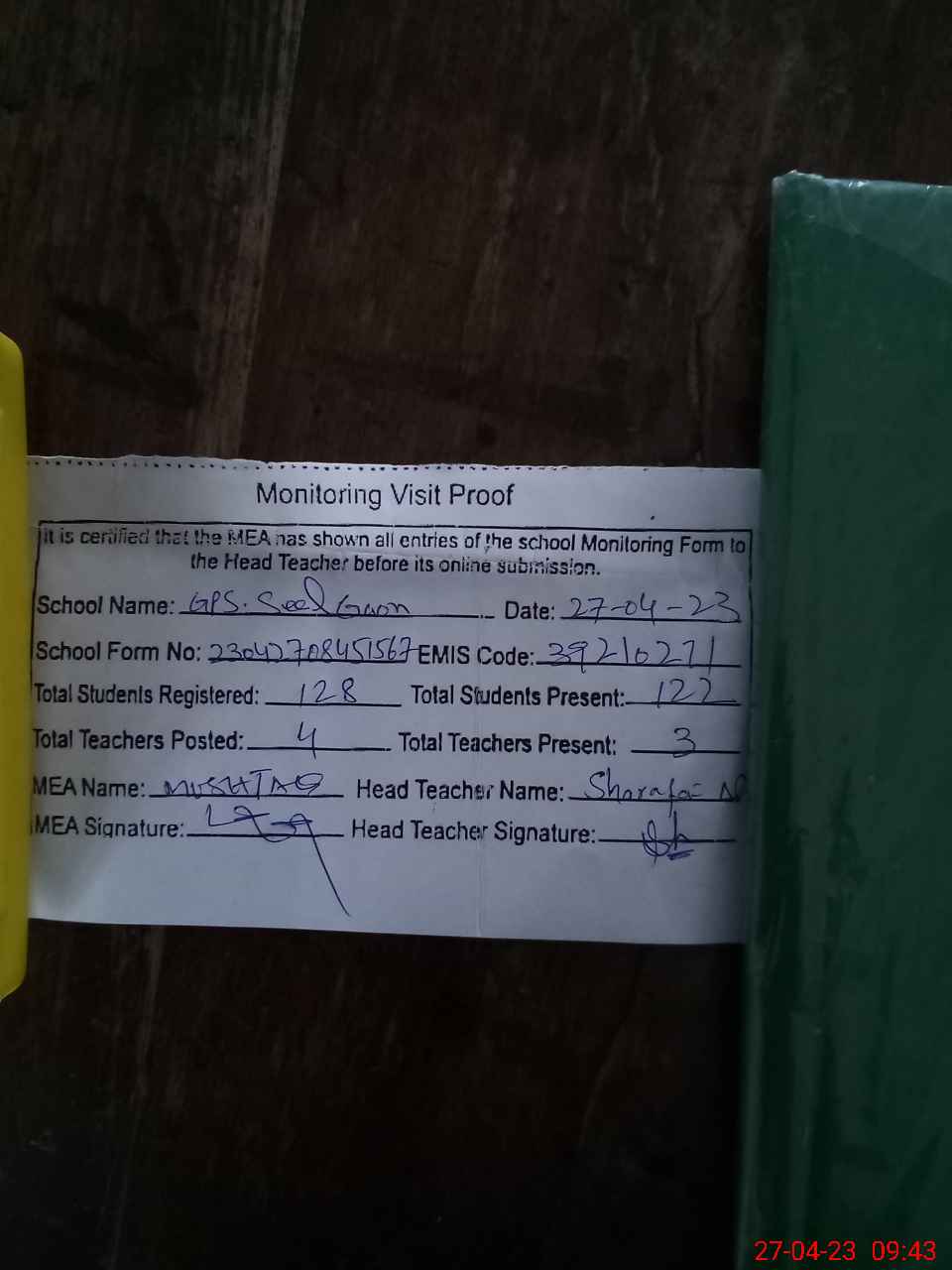 | Attendance Register | Head Teacher | MEA with School | Visit Proof |