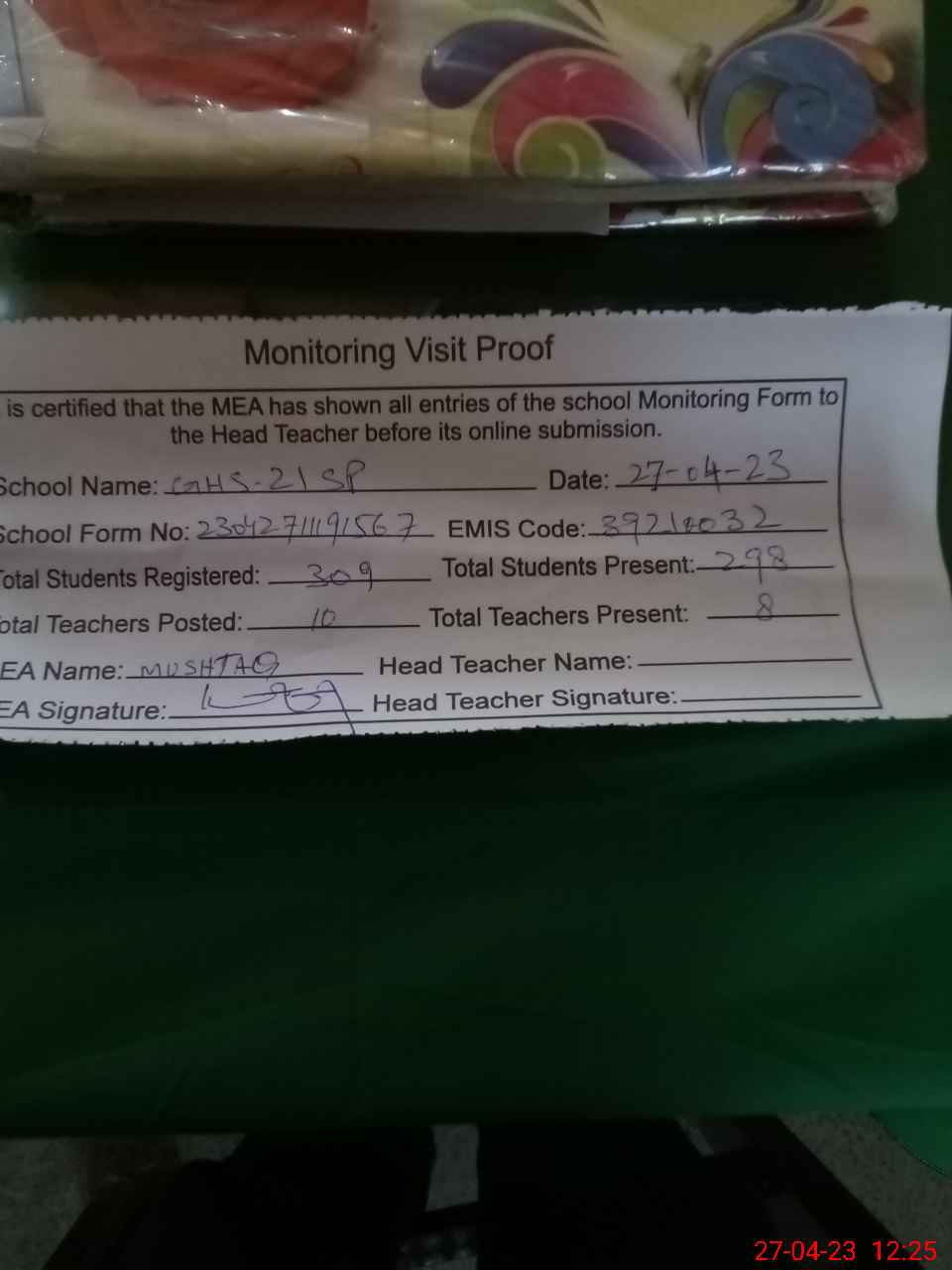 | Attendance Register | Head Teacher | MEA with School | Visit Proof |