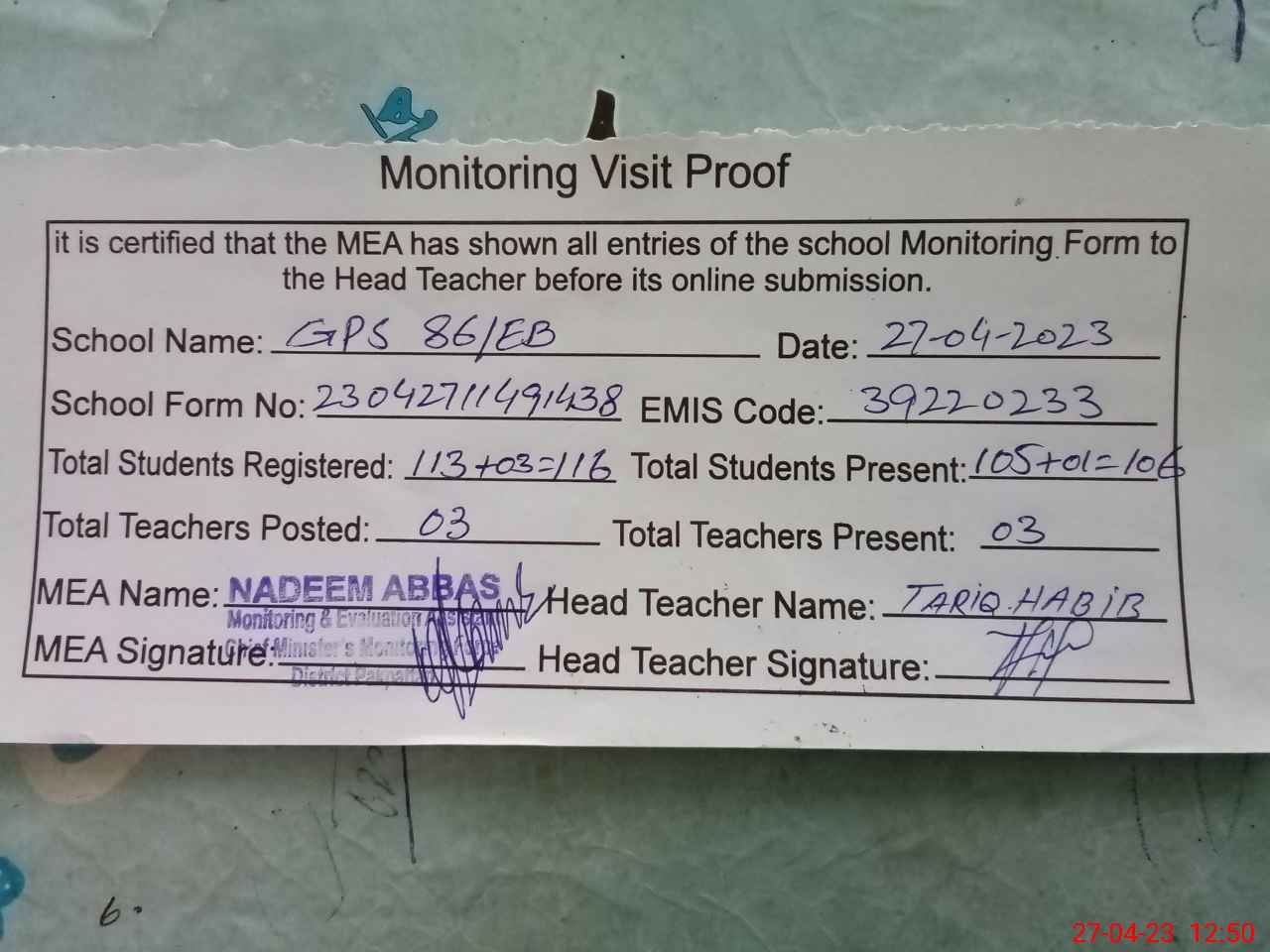 | EMIS Code: 39220233 | Name of School: GPS 86 EB ARIF WALA | |||
