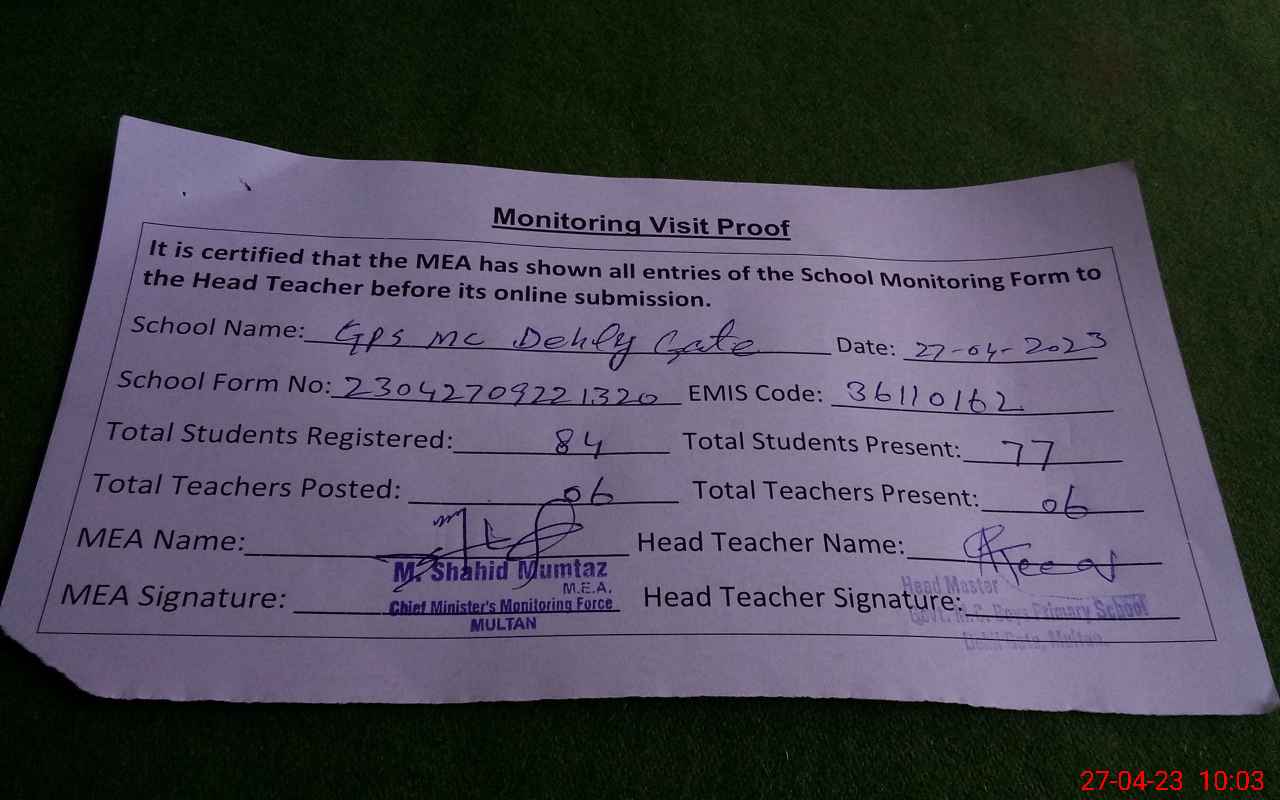 | EMIS Code: 36110162 | Name of School: GPS MC DEHLI GATE MULTAN | |||