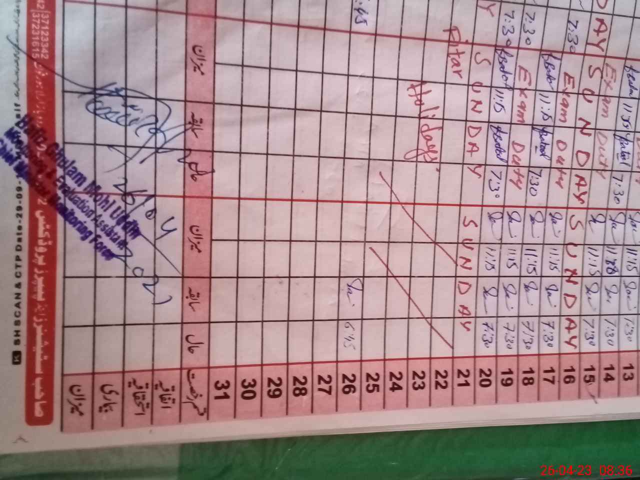 | 38**** | Fa**** Ba**** | PST | Regular | 1 | 0 | 0 | 0 | 0 | 0 | 0 | 0 | 1 | Exam Duty |