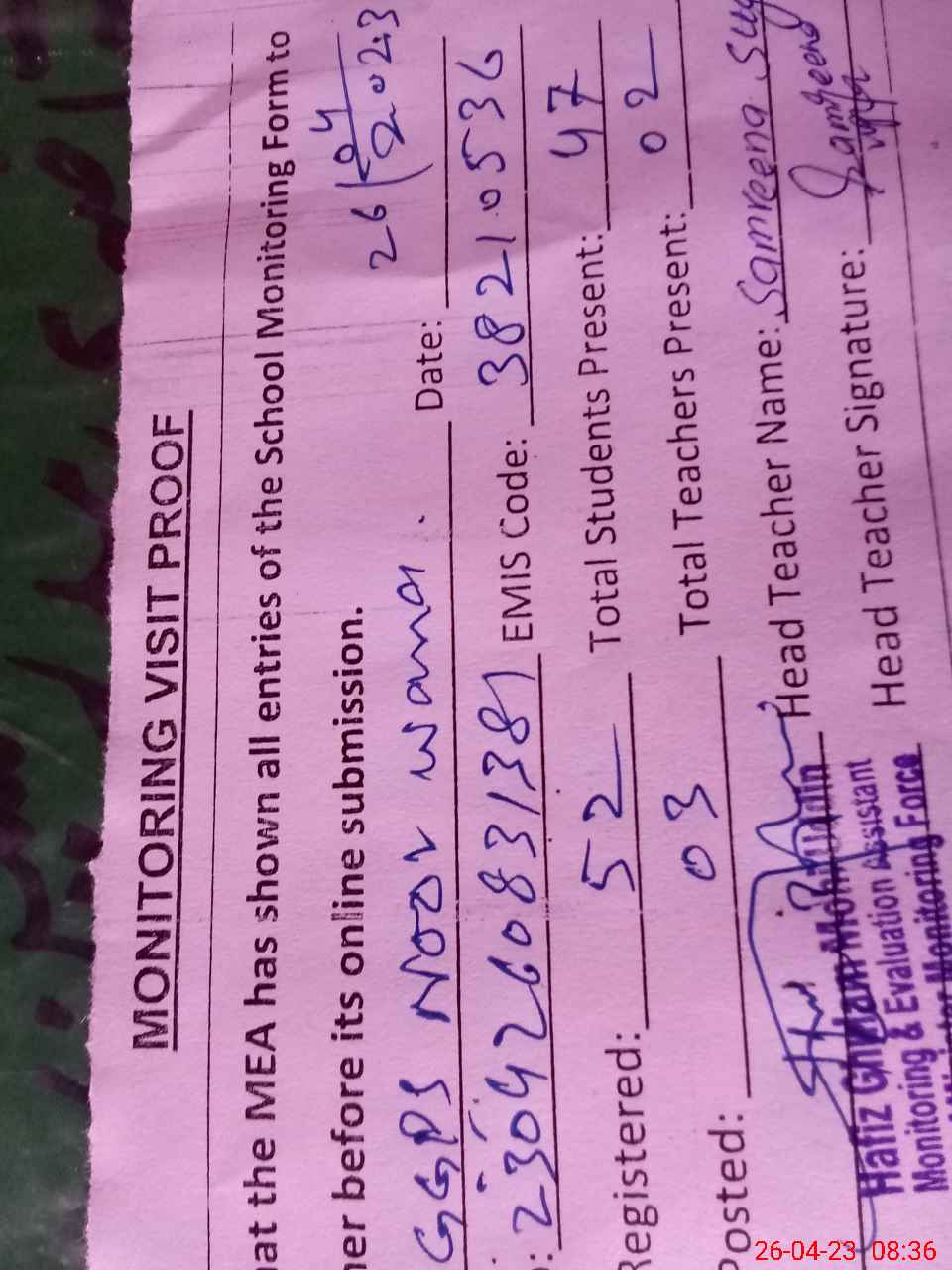 | Attendance Register | Head Teacher | MEA with School | Visit Proof |