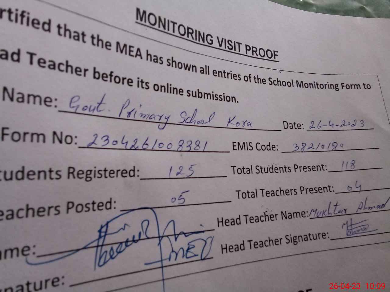 | Attendance Register | Head Teacher | MEA with School | Visit Proof |