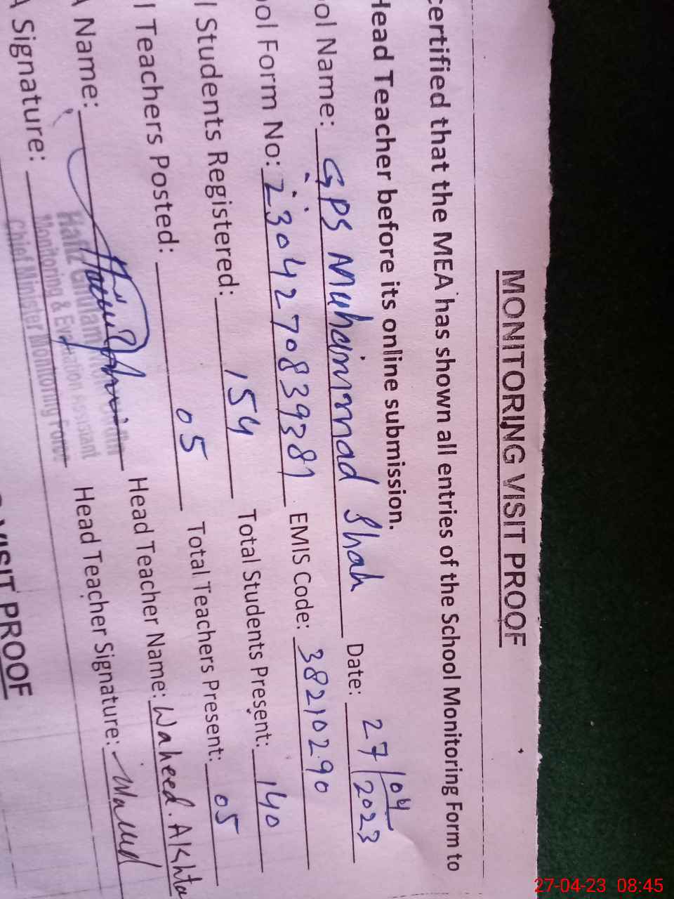 | EMIS Code: 38210290 | Name of School: GPS MUHAMMAD SHAH | |||