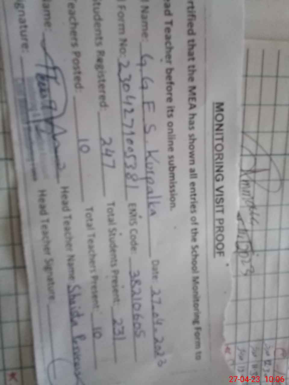 | Attendance Register | Head Teacher | MEA with School | Visit Proof |
