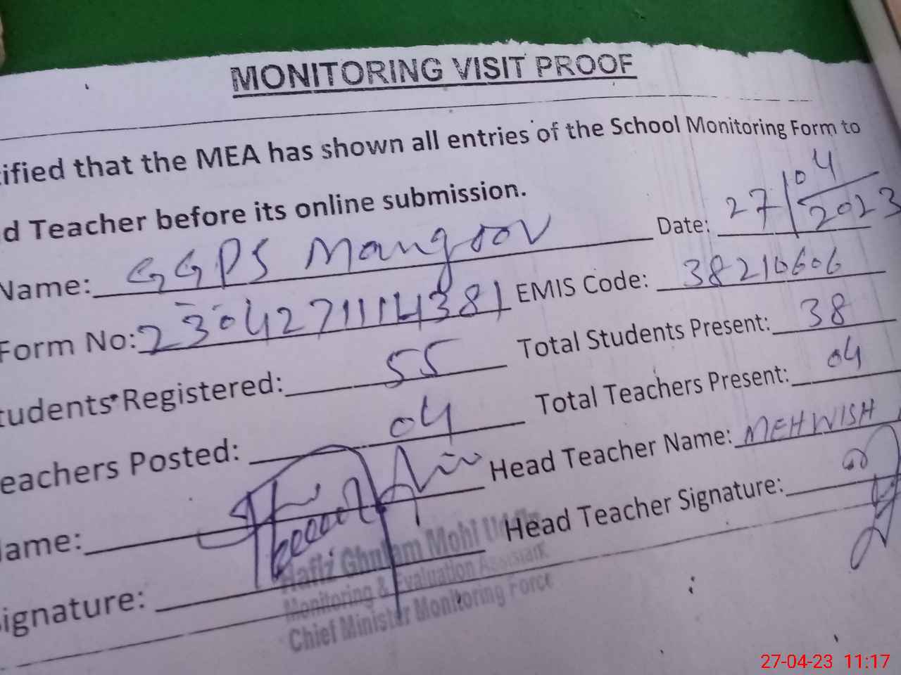 | Attendance Register | Head Teacher | MEA with School | Visit Proof |