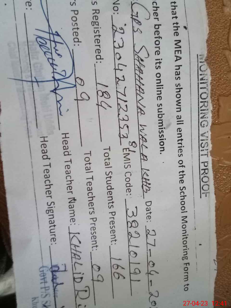 | Attendance Register | Head Teacher | MEA with School | Visit Proof |