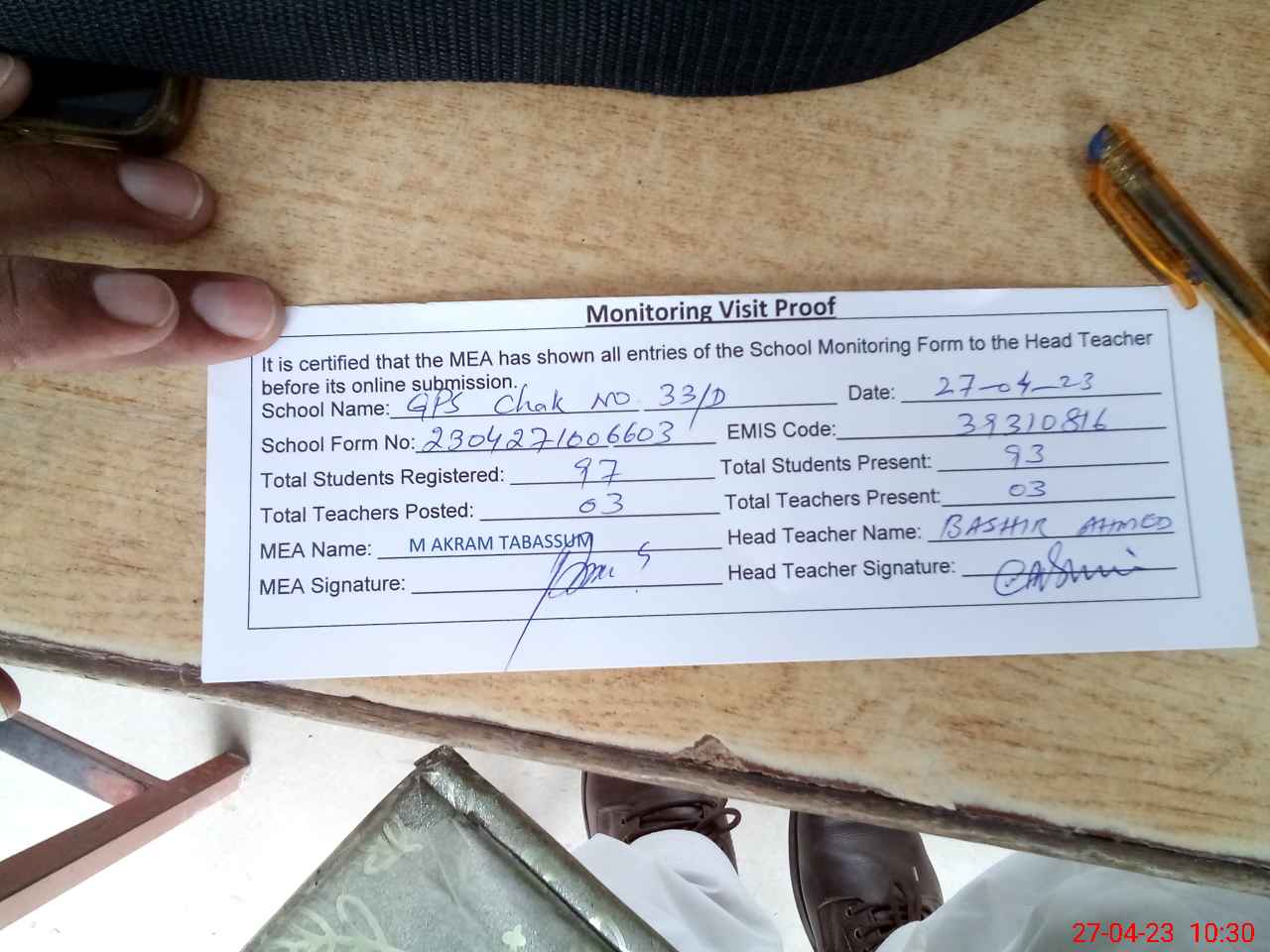 | Attendance Register | Head Teacher | MEA with School | Visit Proof |