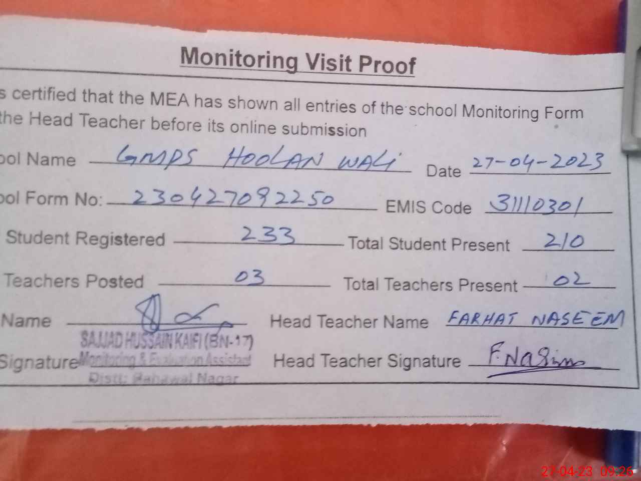 | Attendance Register | Head Teacher | MEA with School | Visit Proof |