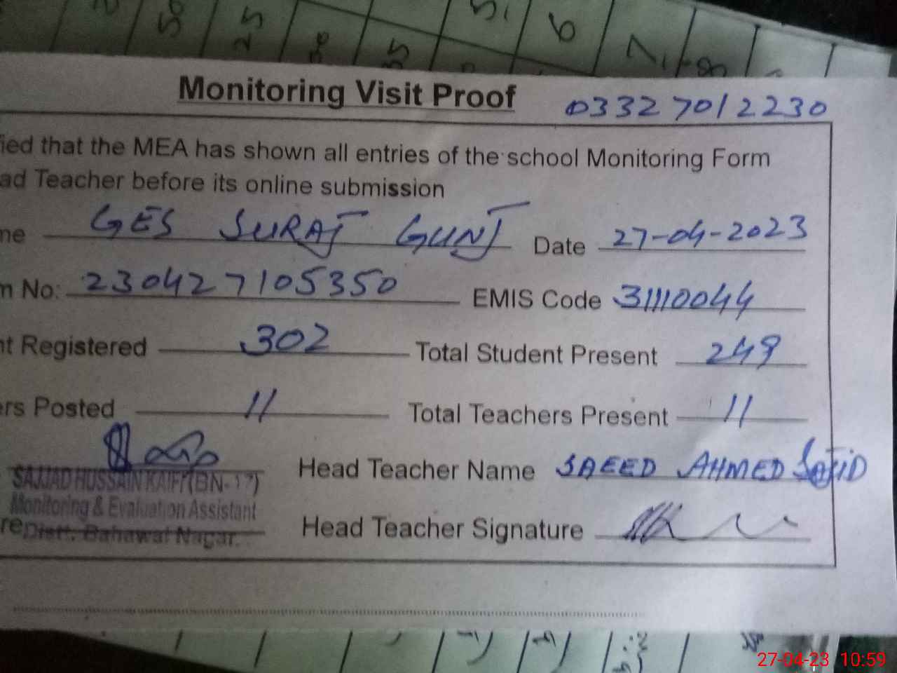 | Attendance Register | Head Teacher | MEA with School | Visit Proof |