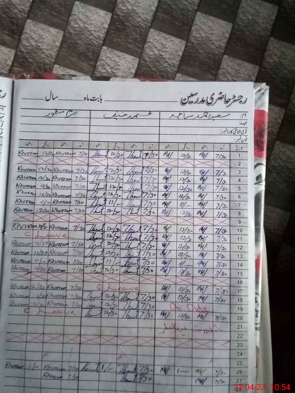 | CNIC | Full Name | Designation | R/C | Absence During Last Calender Month |