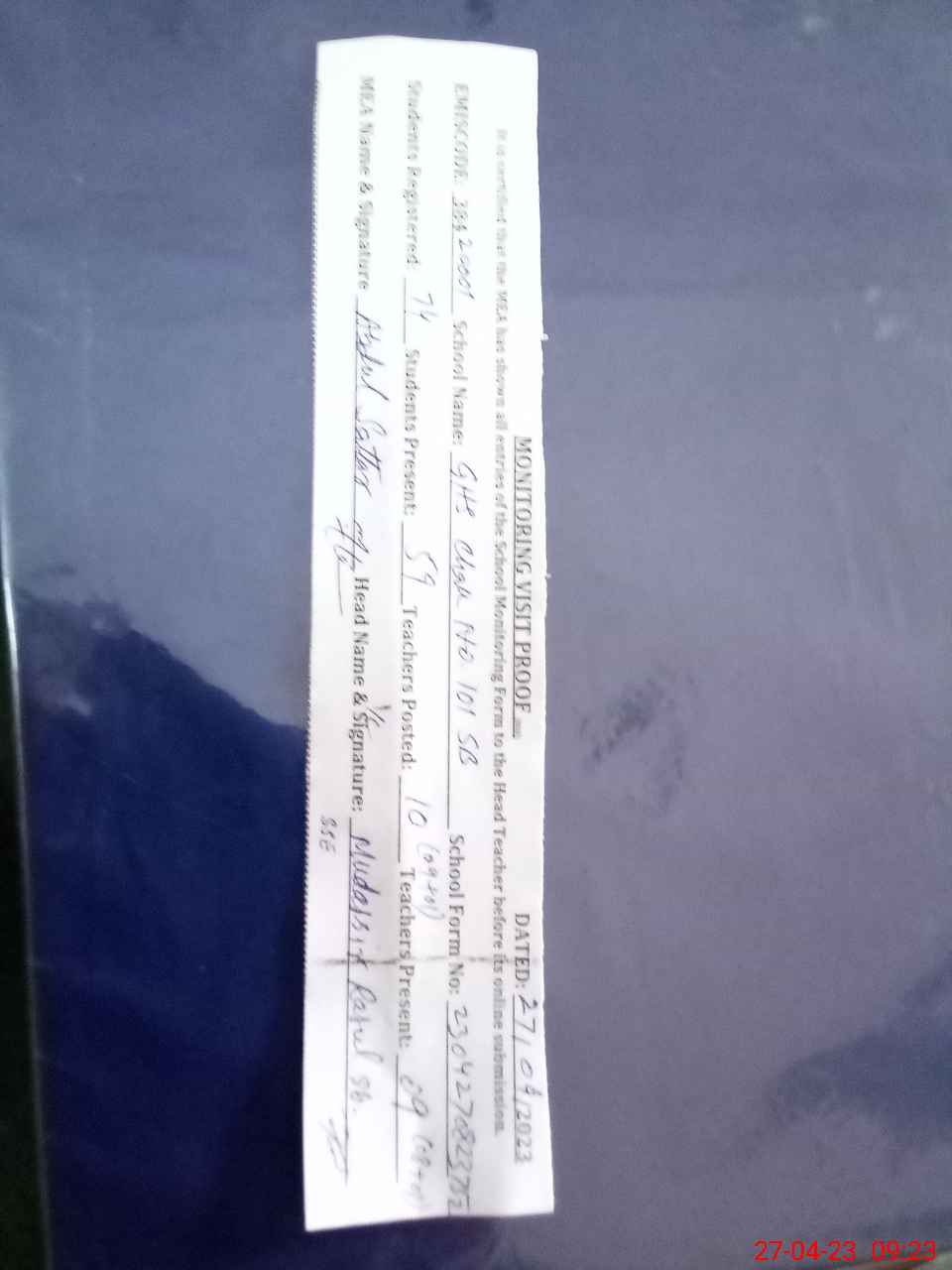 | Attendance Register | Head Teacher | MEA with School | Visit Proof |