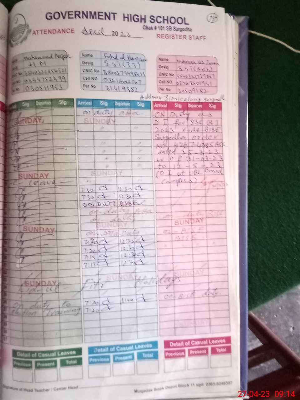 | CNIC | Full Name | Designation | R/C | Absence During Last Calender Month |