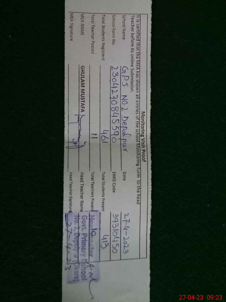 | Attendance Register | Head Teacher | MEA with School | Visit Proof |