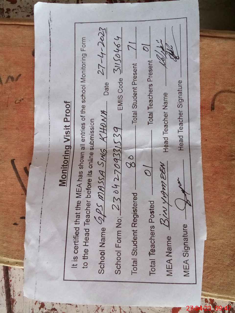 | Attendance Register | Head Teacher | MEA with School | Visit Proof |