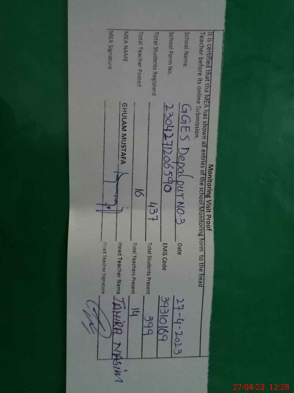 | Attendance Register | Head Teacher | MEA with School | Visit Proof |