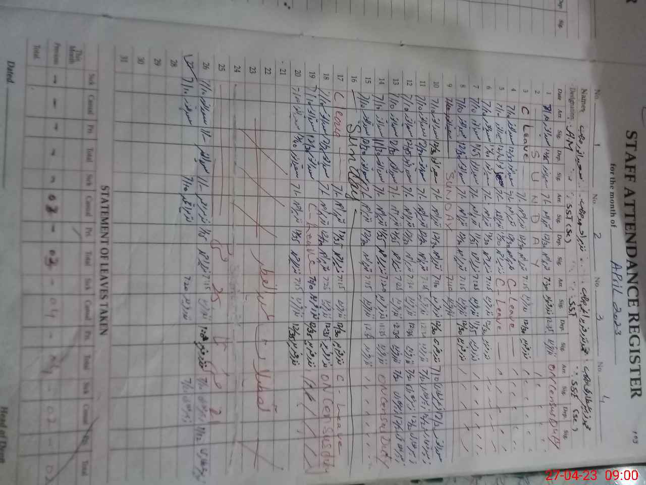 | CNIC | Full Name | Designation | R/C | Absence During Last Calender Month |